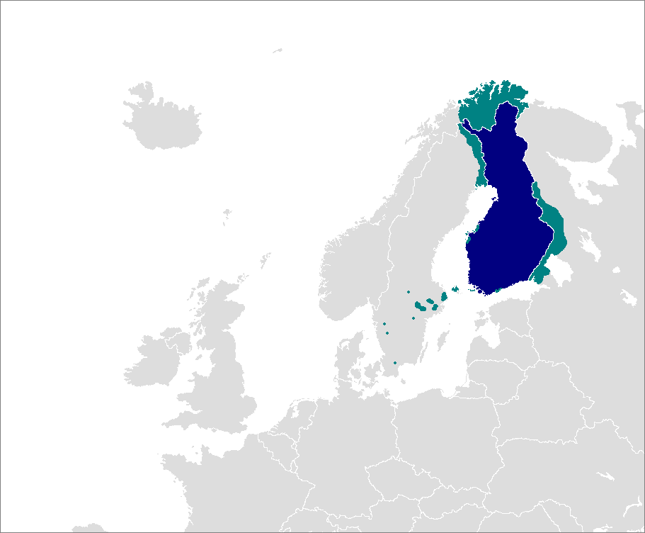 Kartet viser en hvor det finske språket snakkes. Mørkeblå viser hvor finsk er et offisielt språk. Grønt indikerer hvor spårket snakkes av en minoritet. Finsk snakkes både i Norge, Sverige og Russland.